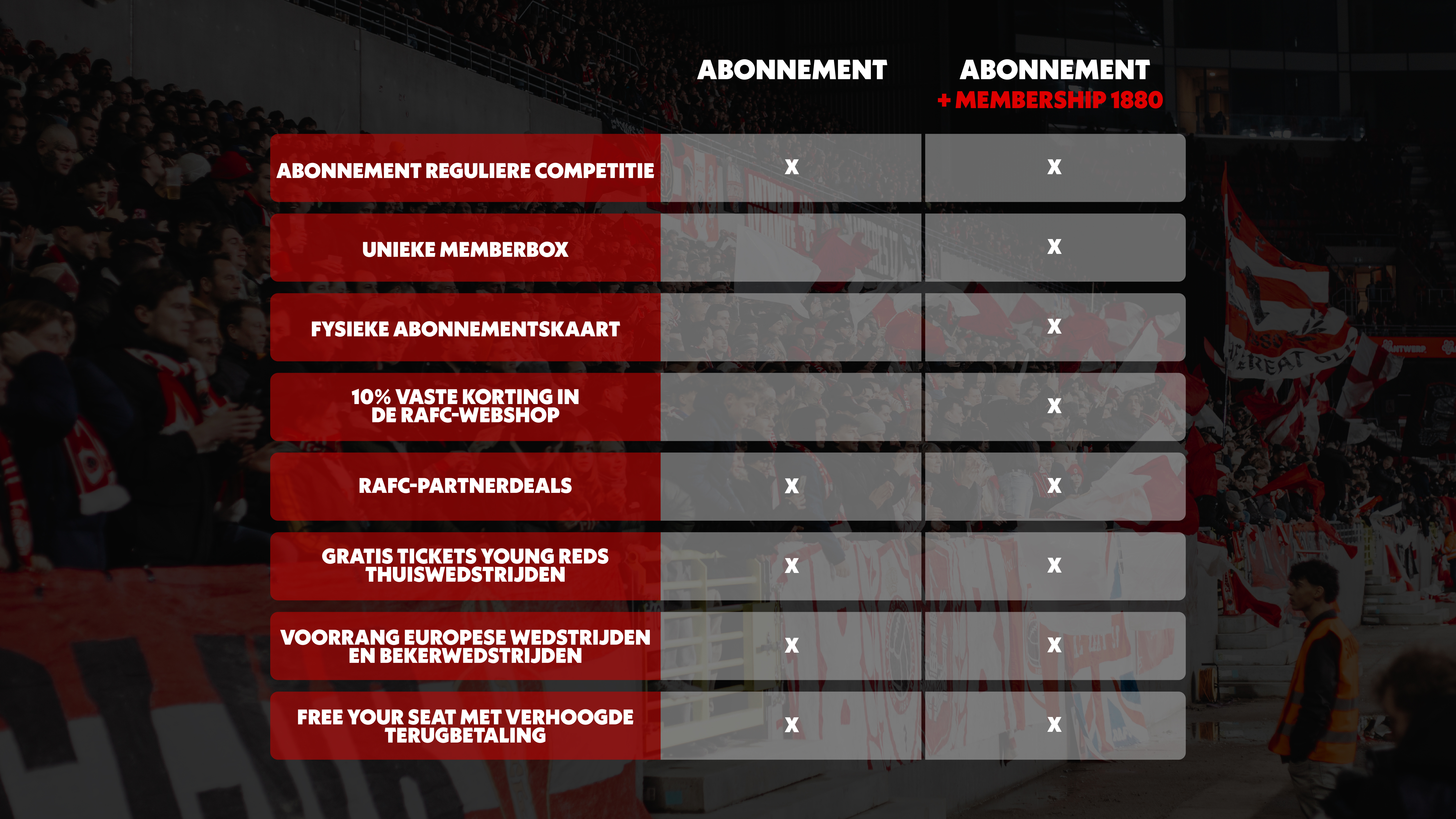 Vanaf het seizoen 2026/27 voert RAFC opnieuw het ‘membership 1880’ in. Een unieke memberbox, een fysieke abonnementskaart of heel het seizoen 10% in onze webshop? Voor slechts 30 euro kan je genieten van deze voordelen. Ook de administratiekosten van het abonnement (9,5 euro) zitten hierin inbegrepen. Voeg het membership eenvoudig toe bij de aankoop van jouw abonnement.