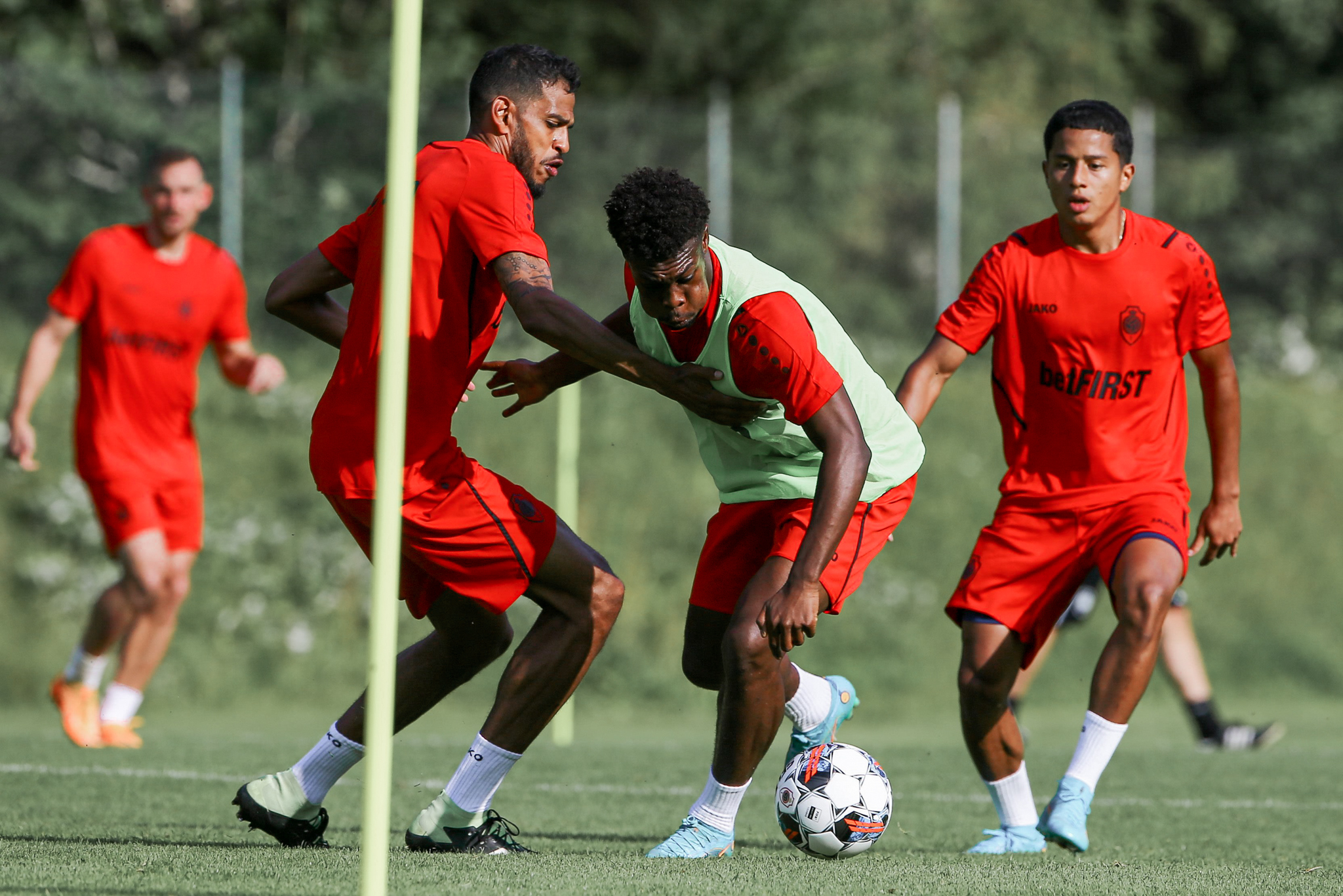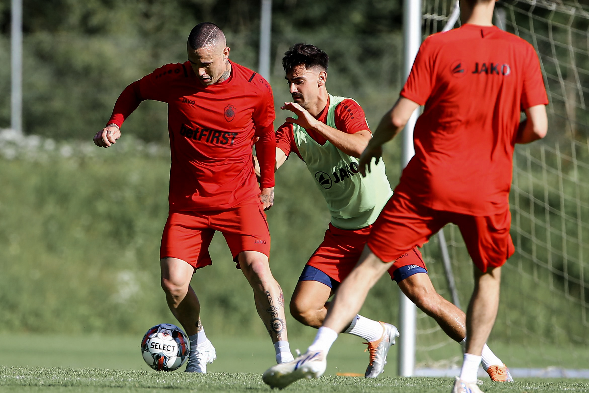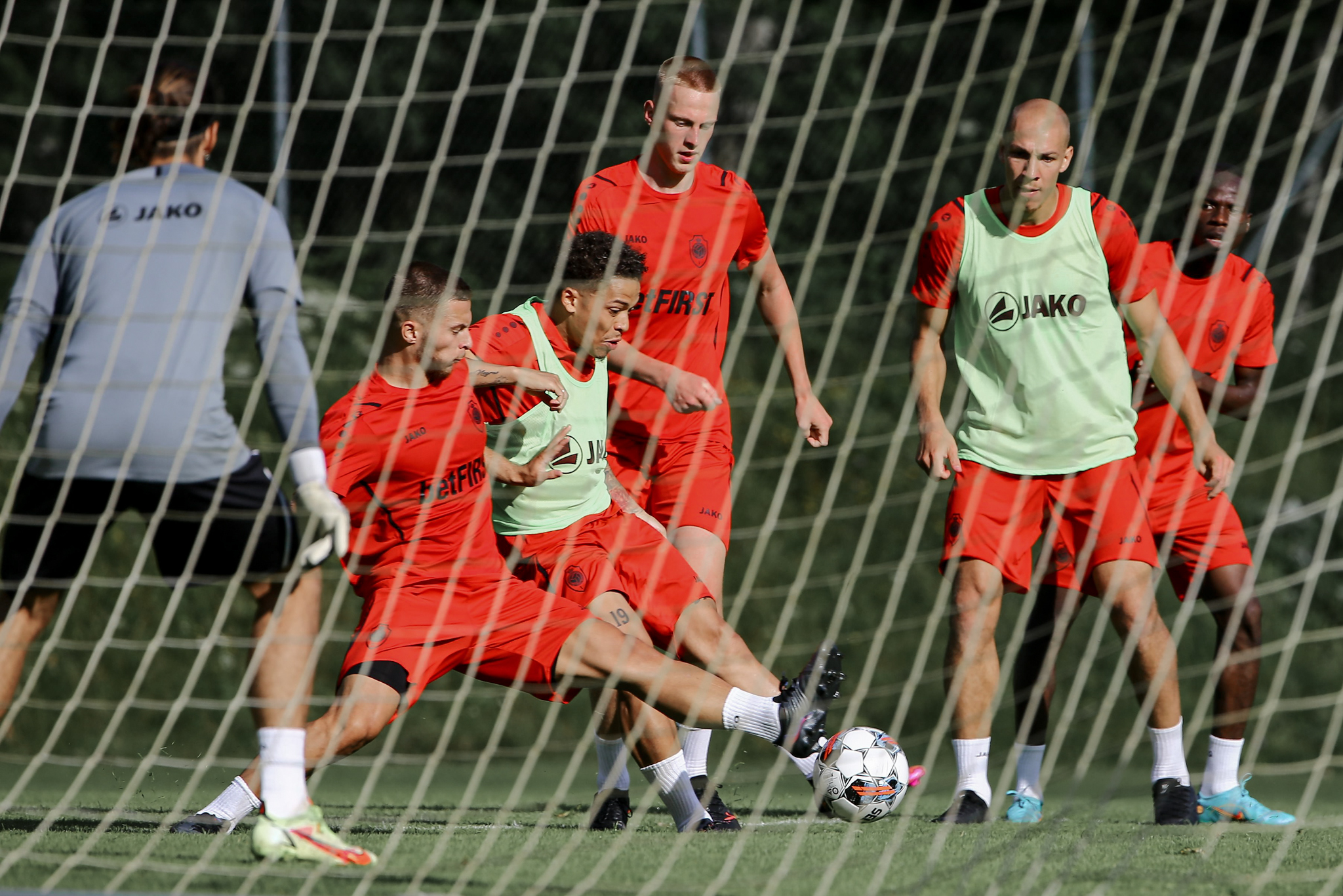 Het weerhield de sportieve staf er niet van om er stevig de pees op te leggen. Onze Reds begonnen met een loopsessie, gevolgd door baloefeningen in kleine groepen en een training in wedstrijdvorm. Lange tijd trainden de vier doelmannen apart onder leiding van keeperstrainer Brian Vandenbussche. Er werd serieus gewerkt maar ook plezier gemaakt.