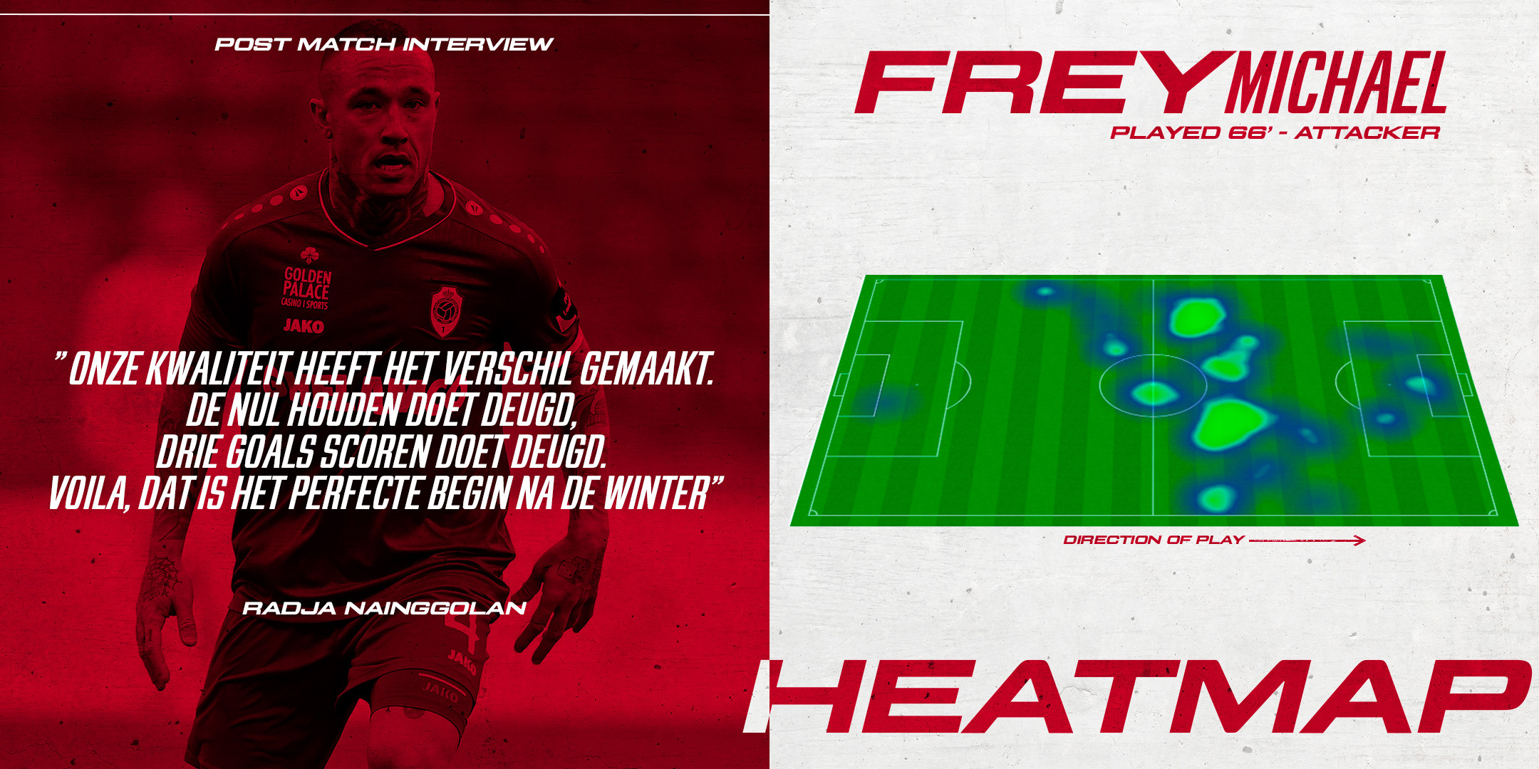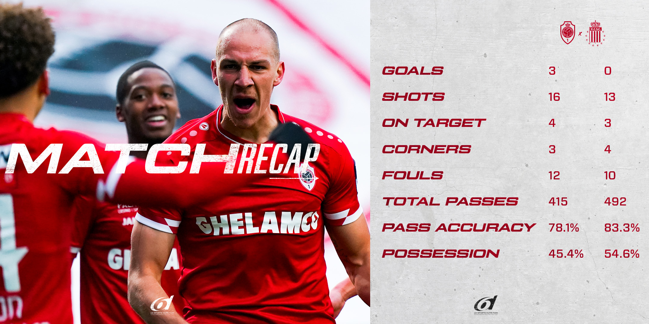Antwerp stuurde Charleroi, toch een rechtstreeks concurrent voor de Champions play-off, met overtuigende 3-0 cijfers huiswaarts. Na een rustig wedstrijdbegin duwde Antwerp na 10 minuten het gaspedaal in en met succes. Op voorzet van Balikwisha kon Frey ongehinderd zijn eerste van het nieuwe kalenderjaar scoren. Frey was op dreef want enkele minuten later zette hij opnieuw de netten bol: 2-0. De dribbel en assist van Benson verdienden minstens evenveel applaus. In de tweede helft lieten de Reds het initiatief aan Charleroi, maar de beste kansen waren wel voor Antwerp. Op het einde scoorde The Great Old een derde keer via de ingevallen Samatta. Een clean sheet, 3 doelpunten, 3 punten: 2022 kon niet beter beginnen. Dankzij deze zege springt RAFC weer naar de 3e plaats in het algemeen klassement.