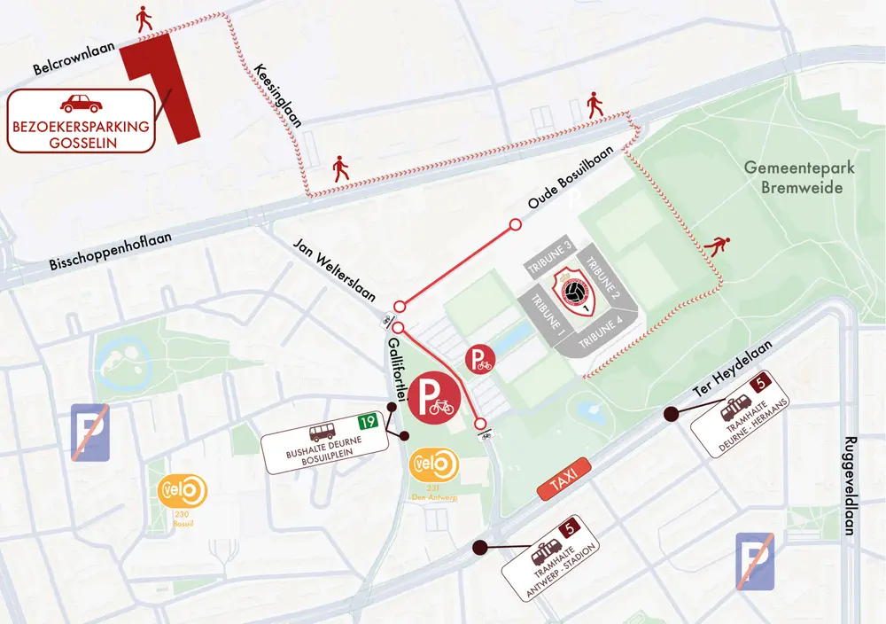 Omwille van de beperkte parkeercapaciteit voor het Bosuilstadion is parkeren enkel mogelijk voor seizoenskaarthouders mét parking aan de Bosuilsite zelf. De club voorziet op wandelafstand extra parkingplaatsen op de Gosselinsite (inrit via Belcrownlaan). Parking Gosselin is vanaf het seizoen 2024/25 betalend. Nieuw sinds het seizoen 2025/26 is dat carpoolen beloond wordt - parkeren op Parking Gosselin is gratis als je met minstens drie personen in de wagen zit. Je hoeft in dat geval geen ticket aan te kopen. Deze visuele controle zal gebeuren door de parkeerwachters.