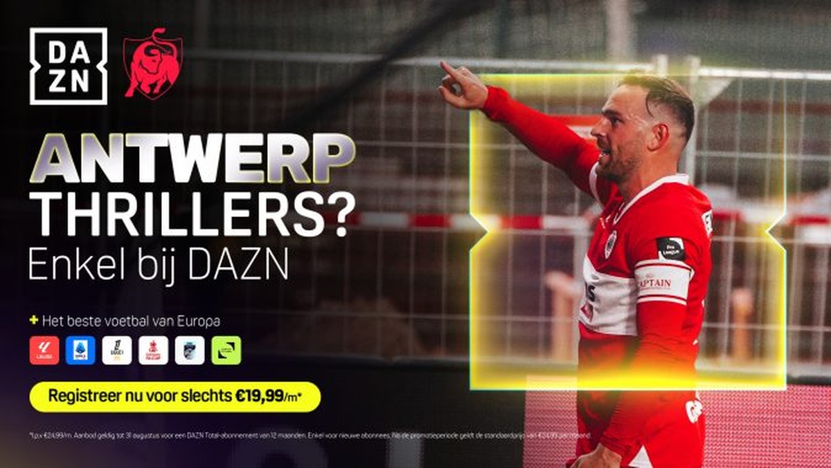Alle wedstrijden. Eén app. Alle wedstrijden van de Jupiler Pro League zijn exclusief te bekijken bij DAZN. Elke minuut, elk doelpunt. Waar en wanneer jij wil. Pre-season aanbieding tot 31 augustus! Profiteer van de early bird-aanbieding: slechts €19,99/maand (gedurende12 maanden) voor het hele seizoen.