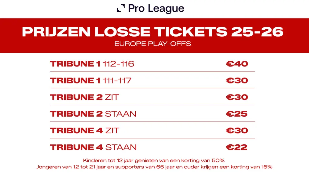 Voor iedere thuiswedstrijd zal er een beperkt aantal extra plaatsen op onze hoofdtribune T1 toegevoegd worden aan de openbare losse ticketverkoop. Via tickets.rafc.be kan je nakijken om welke seats het exact gaat en de daarbijhorende prijs raadplegen (incl btw). Voor deze seats op de hoofdtribune is er géén gunsttarief van toepassing: de prijs blijft hetzelfde ongeacht de leeftijd.